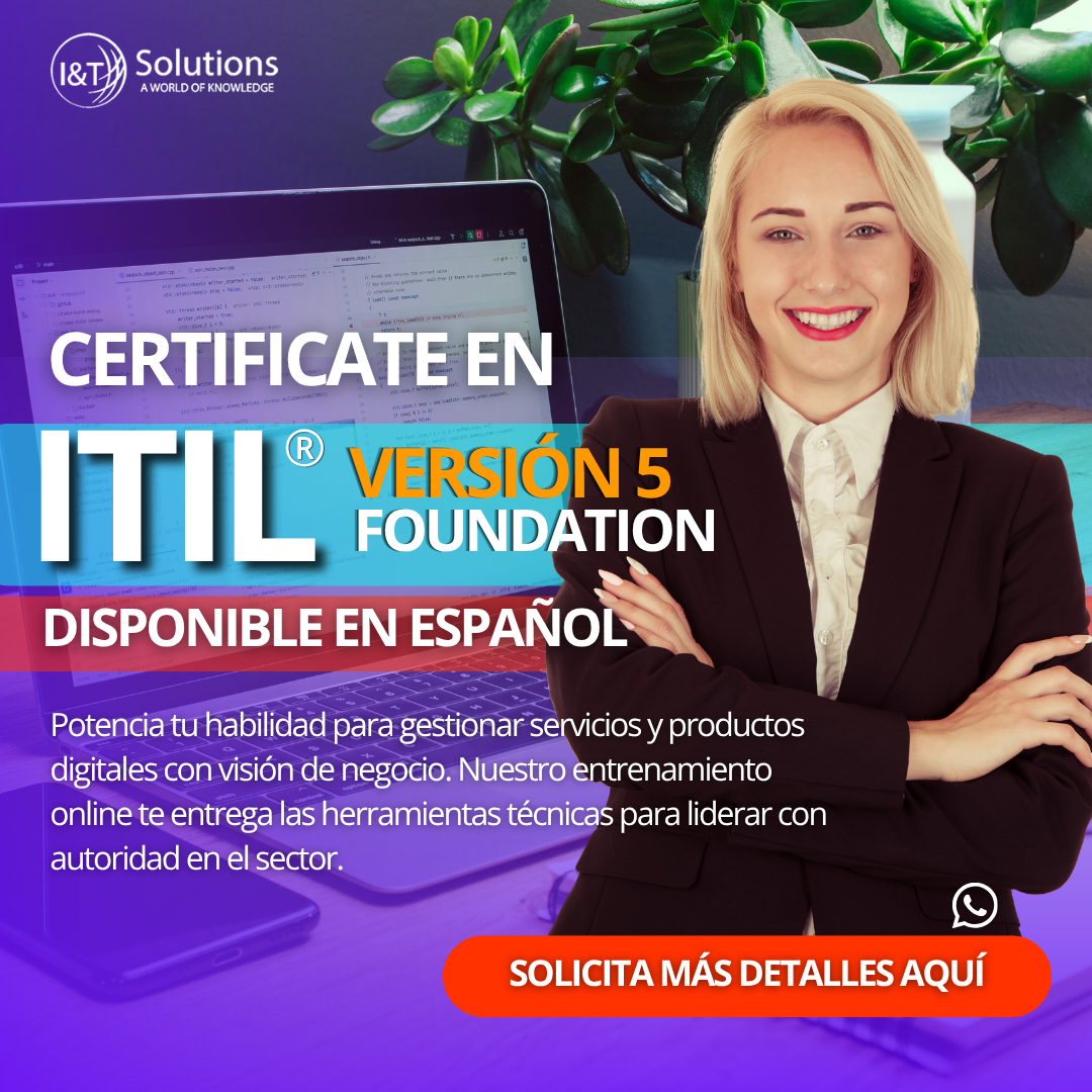 Nuestros cursos destacados en IT abarcan Metodologías Ágiles y Gestión de Proyectos (Scrum, Kanban, OKR, PMP®, entre otras), Inteligencia Artificial, Gobernanza y Gestión de TI, Buenas prácticas de TI con ITIL® 4,Gestión de Productos y Servicios con ITIL® versión 5, Arquitectura Empresarial, Ciberseguridad y Seguridad de la Información, entre otros. Con ellos podrás desarrollar las competencias que el mercado exige hoy y acelerar tu crecimiento profesional.